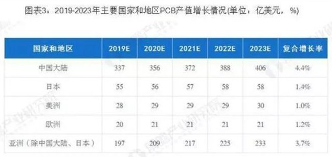 據(jù)Prismark預(yù)測(cè),未來5年亞洲將繼續(xù)主導(dǎo)全球PCB市場(chǎng)的發(fā)展,而中國的核心地位更加穩(wěn)固,中國大陸地區(qū)PCB行業(yè)將保持4.4%的復(fù)合增長率,至2023年行業(yè)總產(chǎn)值將達(dá)到405.56億美元。在PCB公司"大型化、集中化"趨勢(shì)下,已較早確立領(lǐng)先優(yōu)勢(shì)的大型PCB公司將在未來全球市場(chǎng)競(jìng)爭(zhēng)中取得較大優(yōu)勢(shì)。